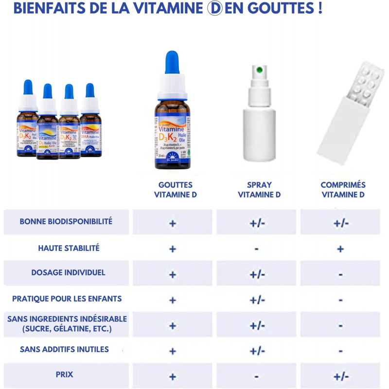 | Vitamine D3 | 20 µg (800 UI) | 50 µg (2000 UI) | 20 µg (800 UI) | 50 µg (2000 UI) | 25 µg (1000 UI) | ✘ | 20 µg (800 UI) | |