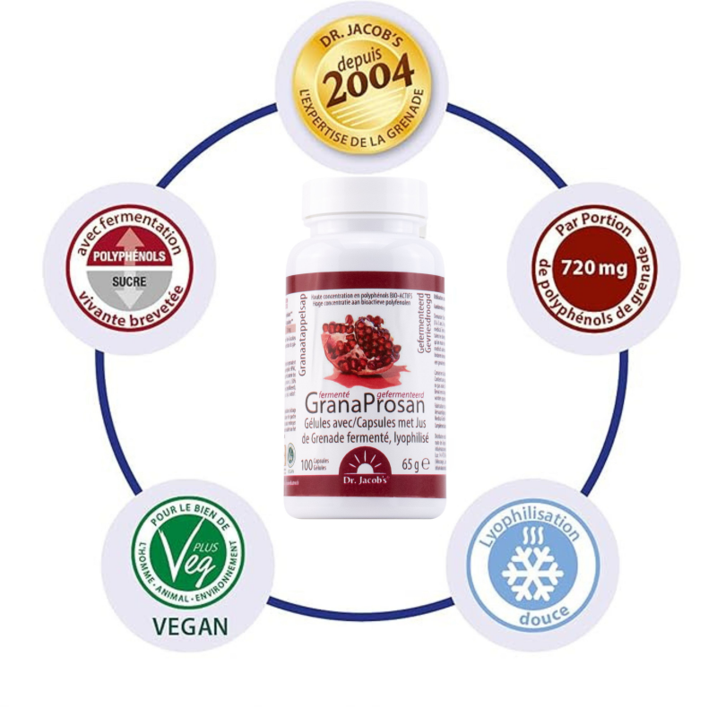 Pour une meilleure assimilation des polyphénols de Grenade, la prise de GranaProsan doit se faire entre les repas, éloigné des protéines animales (poissons, oeufs, laits, fromages...).