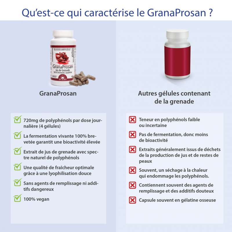La fabrication des gélules impose traditionnellement un séchage à chaud qui entraîne une oxydation et la polymérisation des polyphénols en substances difficilement assimilables. Seule la lyophilisation, comme la pratique le laboratoire Jacob's Medical, conserve la qualité des substances végétales, car elle se déroule à chaque étape du processus, à basse température. Étant donné que le vrai polyphénol de grenade acquiert un goût amer et acidulé, il est plus aisément ingérable en gélules.