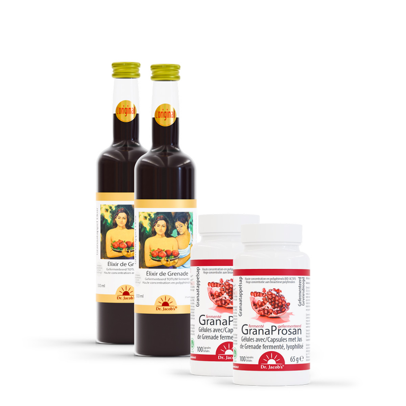 Pack DOUBLE Grenade fermentée comprenant deux bouteilles d’élixir de grenade fermentée Dr Jacob’s® et deux boîte de 100 gélules de Granaprosan. (1000ml d’élixir et 200 gélules de GranaProsan)