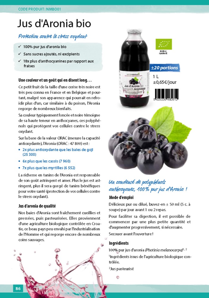 Notre jus d'aronia, certifié bio, est un condensé de polyphénols, riche en anthocyanes (antioxydants), 100% pur : pas de sucre ajouté, ni d'excipient.