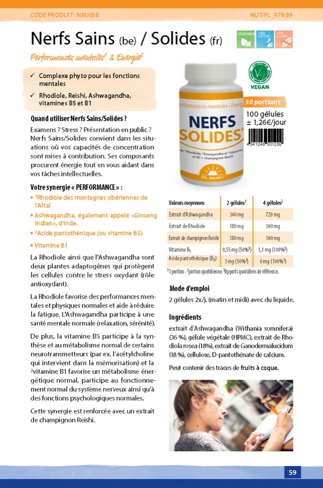 Nerfs Solides/Sains est une synergie de différents nutriments qui conviennent dans de nombreuses situations où vos capacités de concentration ou physique/musculaire sont mises à contribution. Ces composants vous aident au quotidien.