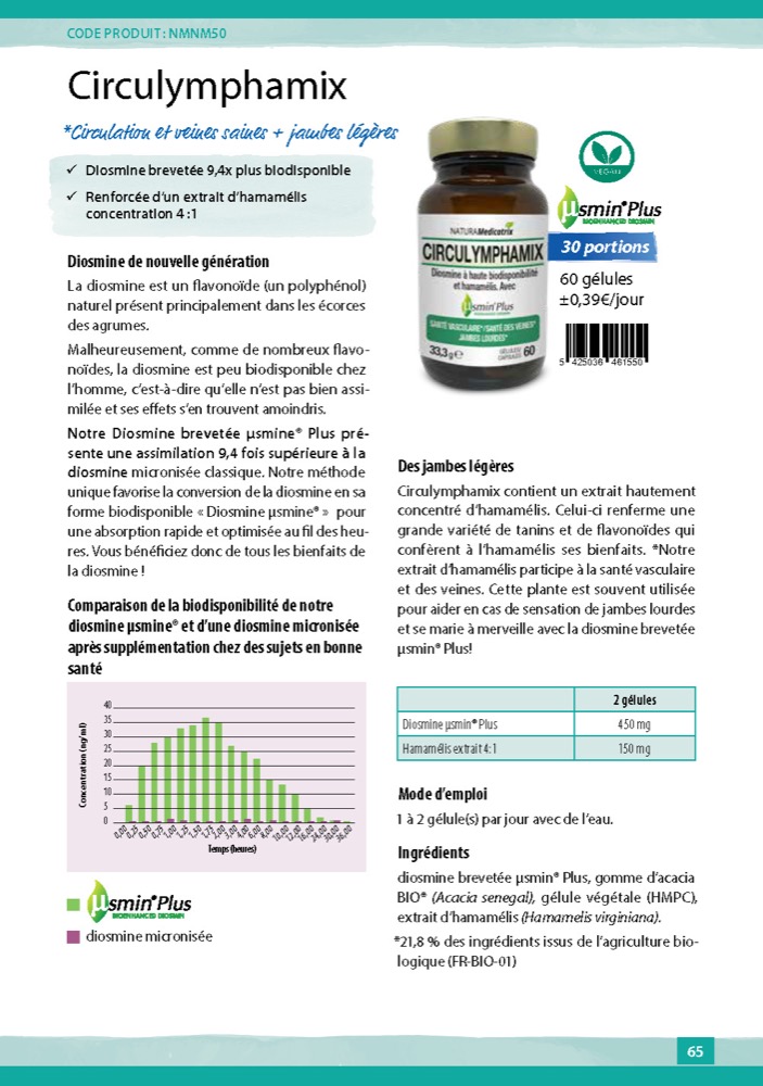 Notre Diosmine brevetée µsmine® Plus présente une assimilation 9,4 fois supérieure à la diosmine micronisée classique.