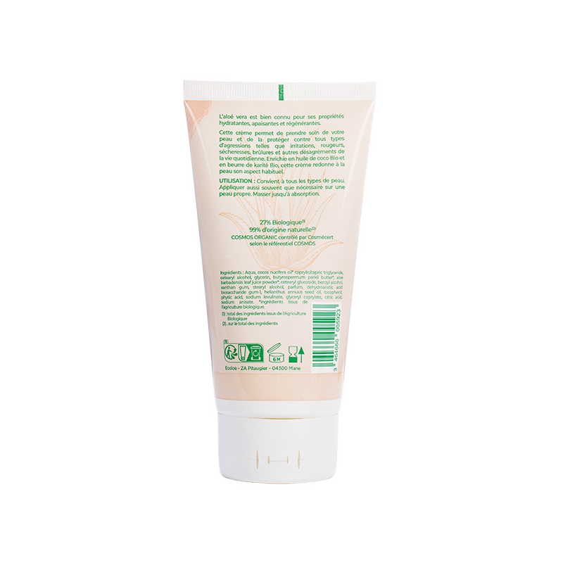 Hydratation et Nutrition L'aloe vera est reconnu pour ses propriétés hydratantes, apaisantes et régénérantes. Associée à l'huile de coco bio et au beurre de karité bio, notre crème nourrit et hydrate intensément la peau, lui redonnant souplesse et éclat.