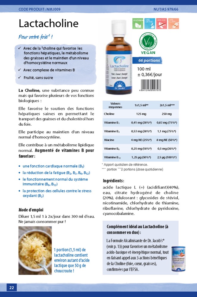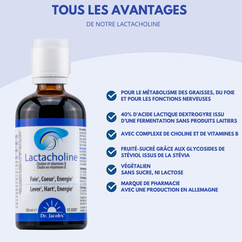La Formule Alcalinisante de Dr. Jacob’s® vous fournit du zinc pour contribuer à un métabolisme acido-basique et énergétique normaux, tout en faisant appel aux 3 actions bénéfiques de la Choline retrouvée dans Lactacholine (foie, coeur, graisses), confirmées par l’EFSA.