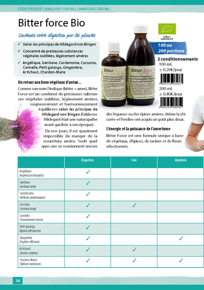 Malgré l'importance d'une alimentation saine, il n'est généralement plus possible, via notre alimentation, d'absorber des quantités suffisantes de substances vitales et surtout de substances amères. C'est là qu'intervient Bitter Force, avec son condensé de substances amères végétales de qualité, certifiées bio et issues des régions alpines : Angélique, Gentiane, Cardamome, Curcuma, Cannelle, Galanga, Gingembre, Artichaut et Chardon-Marie.
