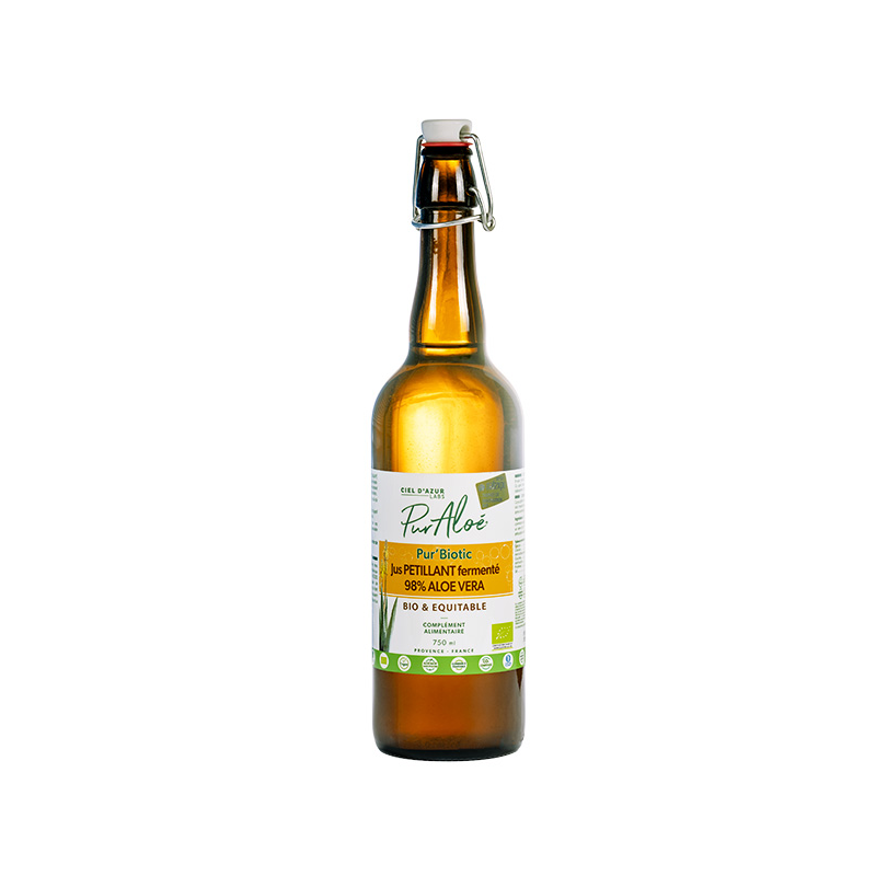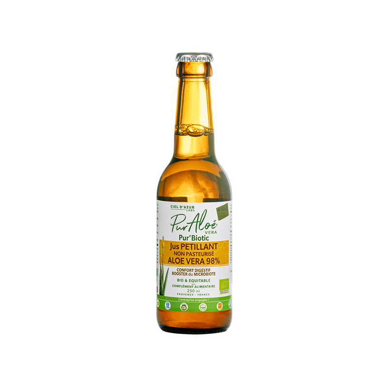 Pur'Biotic Aloe est un Jus d'Aloe vera fermenté et pétillant. Il n'est pas pasteurisé et est conçu pour soutenir votre bien-être digestif.