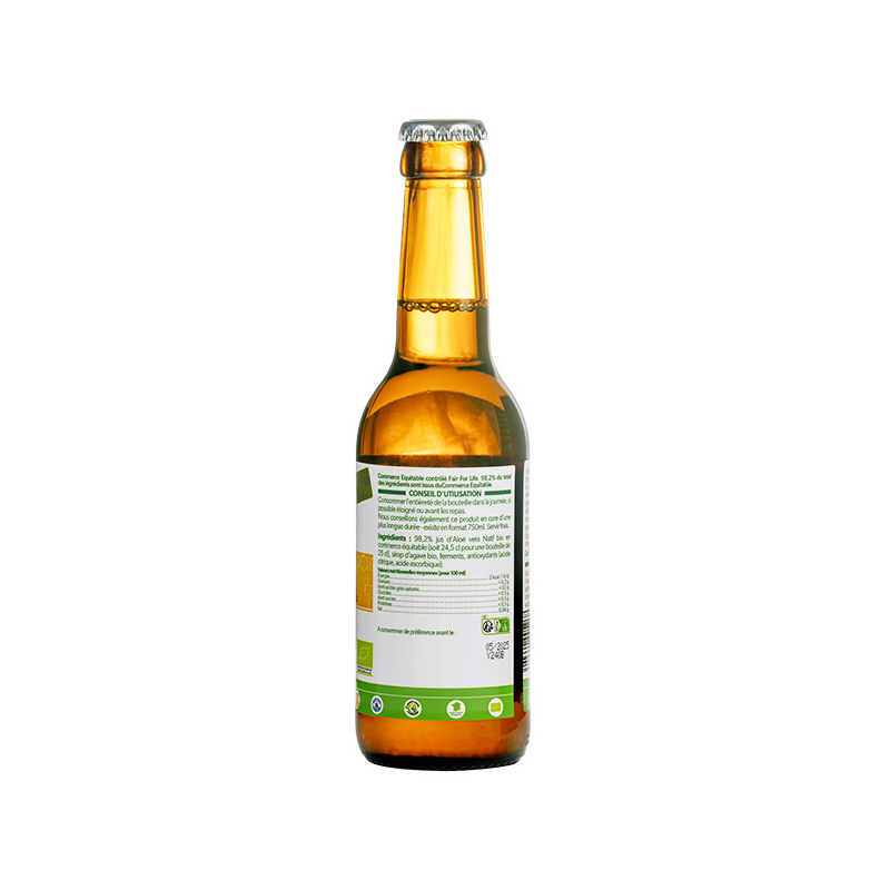 98,2% jus d'Aloé vera* Natif certifié Bio en commerce équitable (soit 24,5 cl pour une bouteille de 25 cl), sirop d'agave* certifié bio, ferments, antioxydants : acide citrique, acide ascorbique.