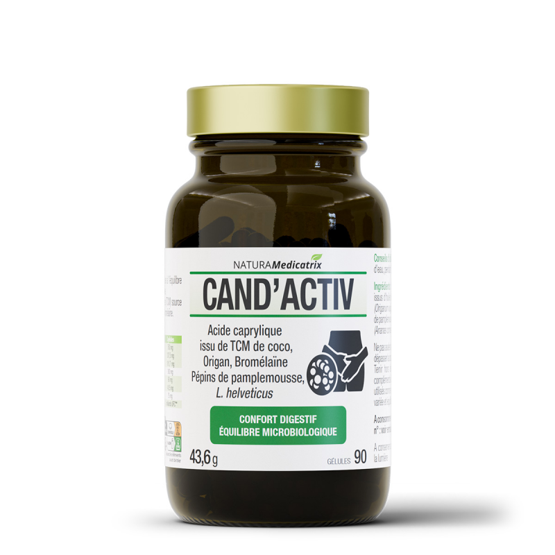 Cand’Activ se distingue par sa composition riche et diversifiée, alliant des ingrédients naturels sélectionnés pour leur efficacité. Il contient des triglycérides à chaînes moyennes (TCM) issus de l’huile de noix de coco, de la poudre de feuille d’origan, de l’extrait de pépins de pamplemousse, de la bromelaïne d’ananas et les Lactobacilles Lactobacillus helveticus. Cette synergie d'ingrédients actifs offre un soutien ciblé à votre organisme.