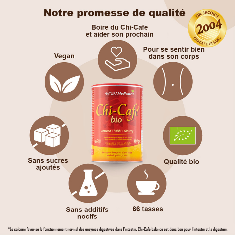 Le café traditionnel peut irriter l'estomac et les intestins, c’est pourquoi beaucoup de personnes ne le digèrent pas correctement. De plus, le café traditionnel affecte l’assimilation de certains minéraux, comme le calcium par exemple. Le Chi-Cafe bio®, par contre, est source de calcium naturel, il est doux, facilement digéré et bien toléré par votre estomac et intestins.
