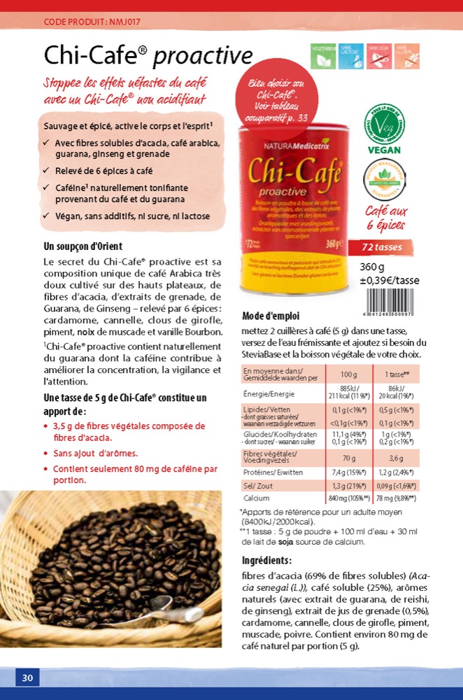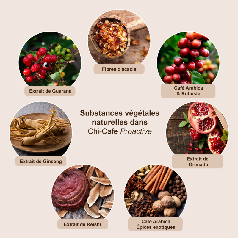 Chi-Cafe proactive contient du café et du guarana qui aide à augmenter la vigilance et améliore la concentration.