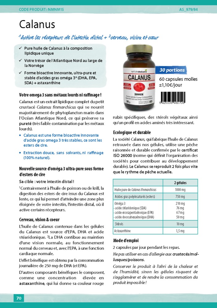 La société Calanus, qui fabrique l’huile de Calanus retrouvée dans nos gélules, utilise une pêche raisonnée et durable confirmée par le certificat ISO 26000 (norme qui définit l’organisation des sociétés pour contribuer au développement durable).