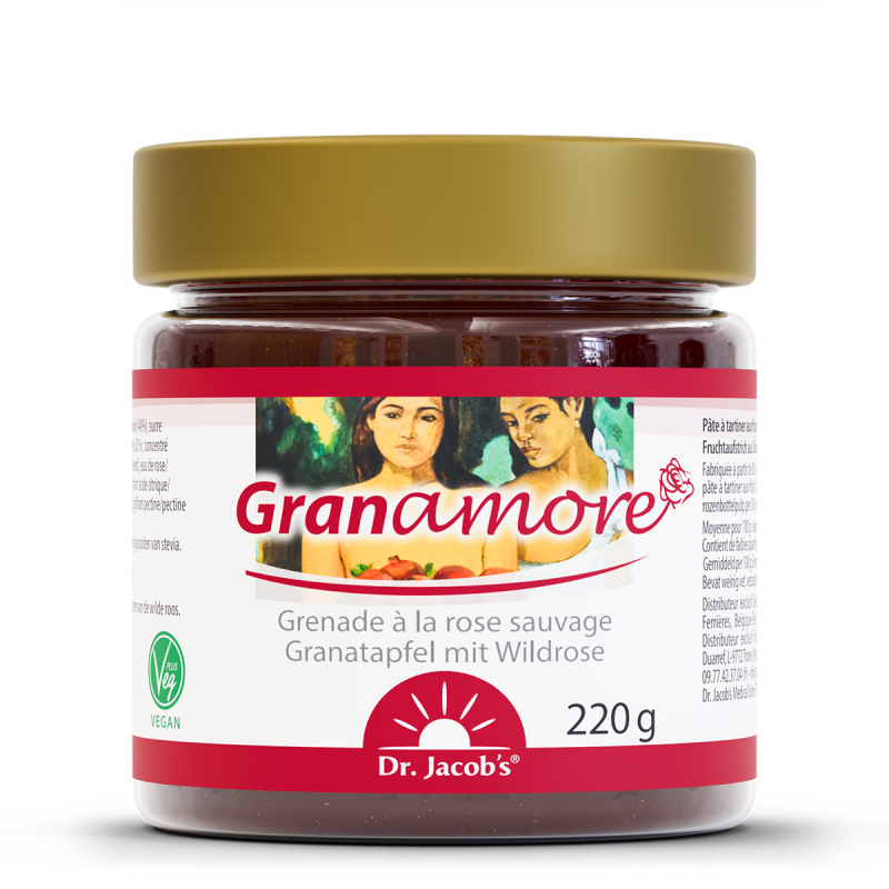 Granamore, c’est bien plus qu’une simple pâte à tartiner. Fabriqué à partir de 80 g de jus et de pulpe de grenade et de 40 g de pulpe de cynorrhodon pour chaque 100 g de produit, cette pâte à tartiner vous offre une richesse inégalée en fruits, soit 120 g de fruits pour 100 g de pâte.