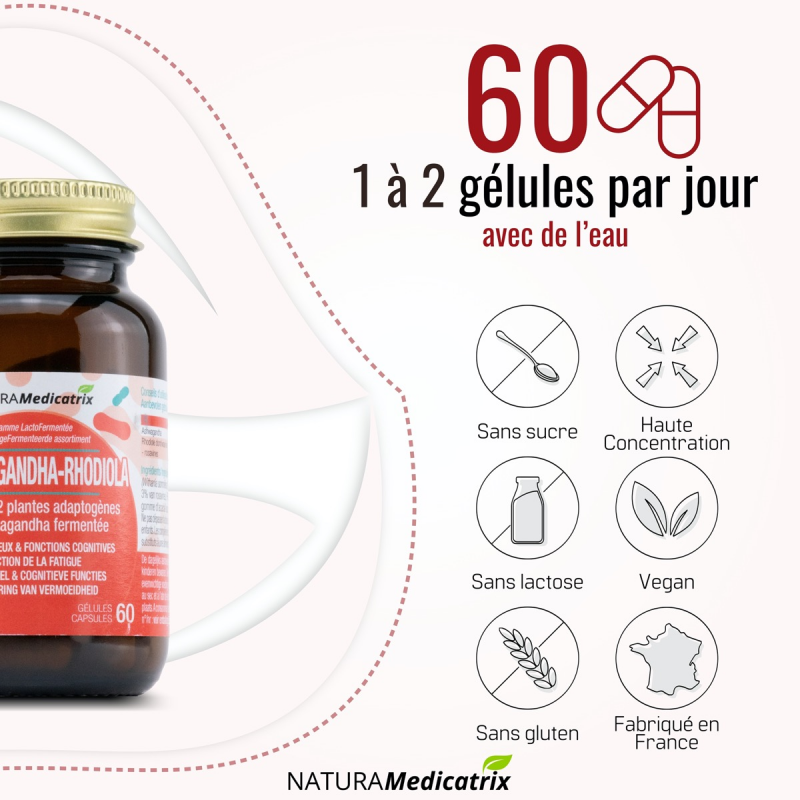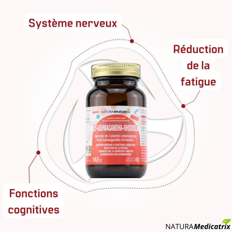 L’Ashwagandha et la Rhodiola sont 2 plantes adaptogènes qui agissent en synergie et vous aident à la fois pour soutenir le fonctionnement normal de votre système nerveux (calme, sérénité) et de vos fonctions cognitives et psychologiques (concentration, apprentissage, mémorisation).