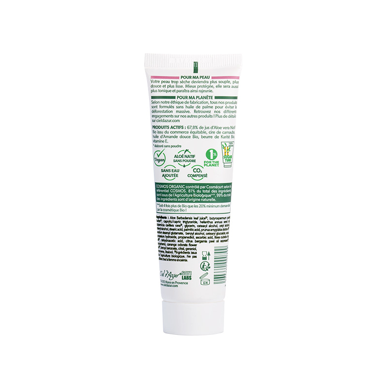 PRODUITS ACTIFS : 67,8% Aloe Vera natif* Bio**, huile d’Amande douce Bio**, beurre de Karité Bio**, cire de carnauba, vitamine E. SANS SULFATES.