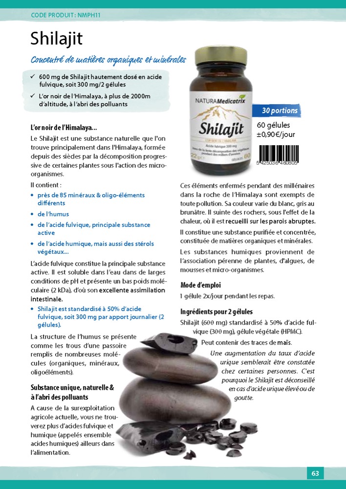 Chaque gélule est constituée de 600 mg de Shilajit. Celui-ci est essentiellement constitué d'humus qui se décompose lentement, de constituants organiques caractéristiques des sols, et d'acides fulviques : "molécules porteuses", en acides humiques et en oligo-éléments (Fer, Calcium, Cuivre, Zinc, Magnésium, Manganèse, Molibdène, Potassium...).
