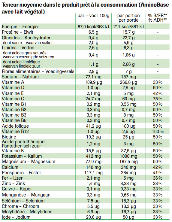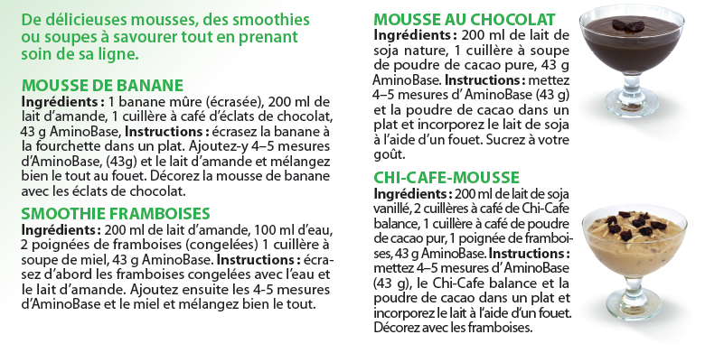 Mousse de lait : avec un fouet, mélanger 5 mesures d’AminoBase (43 g) à 200 ml d‘un lait végétal (avec 2,3 g de sucre et 120 mg de calcium par 100 ml). (certains laits végétaux augmentent la teneur en sucre et en calories du produit prêt à la consommation).