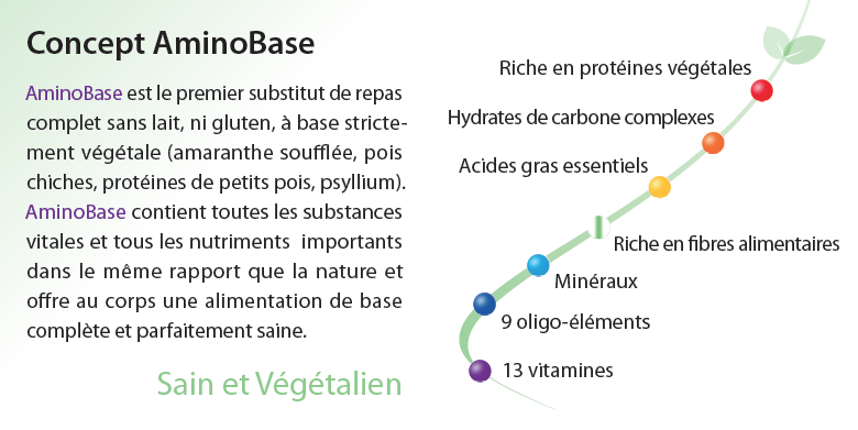 Un concept unique en son genre : AminoBase est une nourriture biologique végétalienne globale à base purement végétale. Comme substitut complet de repas, AminoBase fournit tous les acides aminés essentiels, des glucides complexes, des fibres alimentaires, des acides gras essentiels, des vitamines et des minéraux. La combinaison d’amaranthe et de légumineuses donne un profil optimal en acides aminés à valeur biologique élevée.
