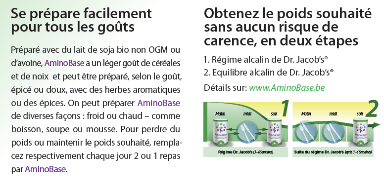Le régime amaigrissant AminoBase n’atteint les résultats espérés que dans le cadre d’une alimentation pauvre en calories. Veillez à l’apport suffisant de liquides pendant son utilisation (2-3 litres d’eau ou de thé non sucré par jour).