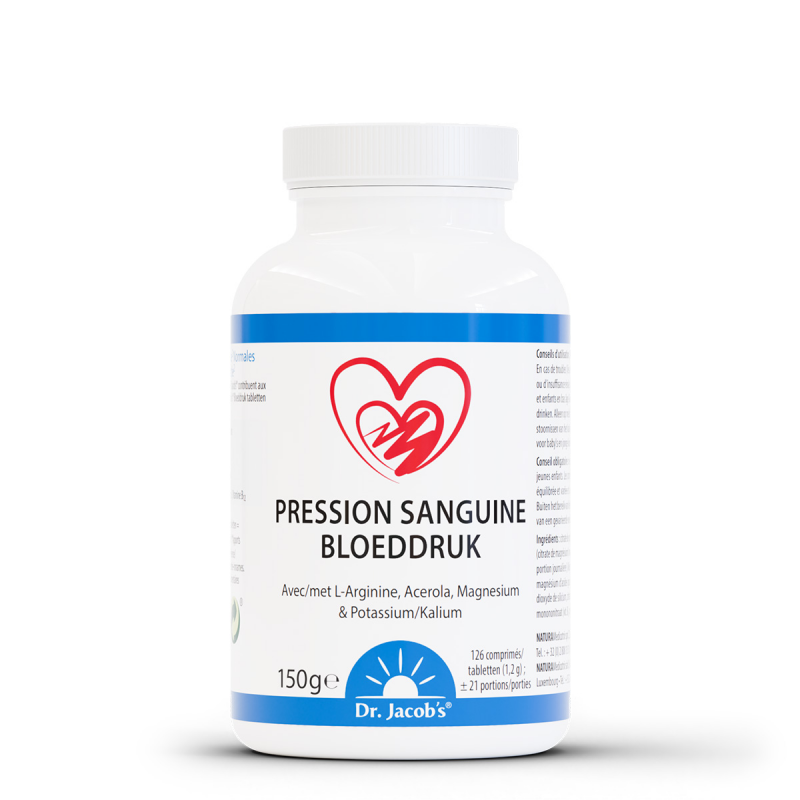 La L-Arginine est un acide aminé semi-essentiel. D'une part, c'est un composant naturel des protéines de l'organisme, mais il sert aussi de matière première pour la formation de NO. La L-arginine est particulièrement abondante dans les aliments végétaux comme les noix et les légumineuses. Avec une alimentation déséquilibrée et dans les moments exigeants de la vie, nous pouvons soutenir l'organisme par la prise de L-arginine. La L-Arginine est présente dans les comprimés de Pression sanguine de Dr Jacob’s® sous forme alcaline et non sous forme de chlorhydrate acidogène. Les comprimés de Pression sanguine de Dr Jacob’s® contiennent 1 600 mg de L-Arginine par portion.