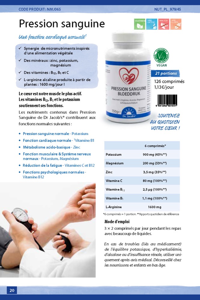 Les comprimés « Pression sanguine » de Dr Jacob’s® contiennent la combinaison parfaite de minéraux, des vitamines sélectionnées et de la L-arginine, qui est produite à partir de plantes. Sa composition s’inspire d’une alimentation végétale.