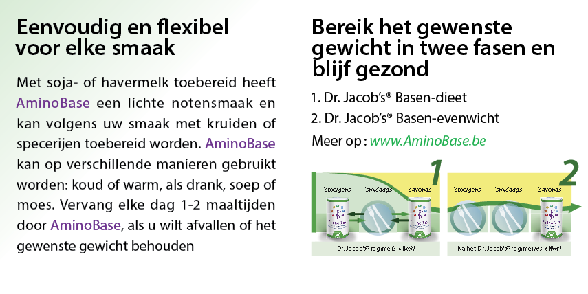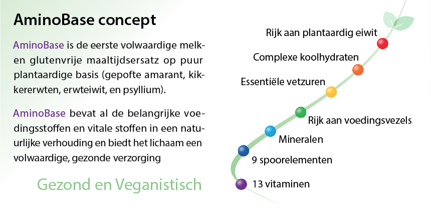 AminoBase is de eerste volledige maaltijd vervanger, zonder melkgluten, een uitsluitend plantaardig (amarant, kikkererwten, erwt eiwit, psyllium). AminoBase bevat alle belangrijke voedingsstoffen en vitale stoffen in een natuurlijk evenwicht, en zorgt voor een gezonde bron van nutrienten aan het lichaam.