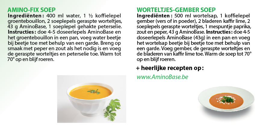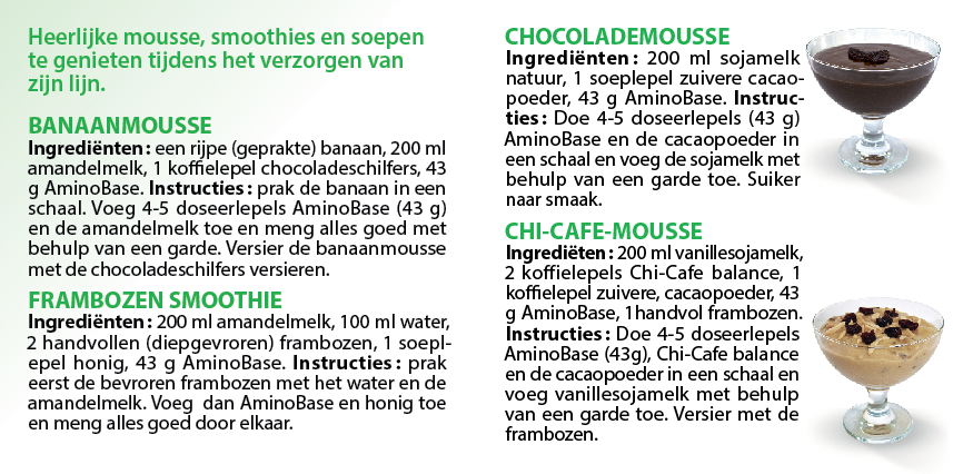Gemakkelijk te gebruiken en op verschillende manieren te genieten : Met plantaardige melk toebereid heeft AminoBase een lichte notensmaak en kan op verschillende manieren worden gesmuld: koud of warm, als moes, drank of soep. Heerlijke receptideeën vindt u op: www.aminobase.info